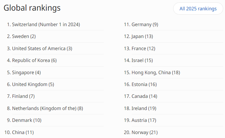 Europe hosts 15 economies ranked among the global top 25, including six in the top 10. Switzerland (1st) retains the global lead, followed by Sweden (2nd), the United Kingdom (6th) and Finland (7th). Thirteen out of 39 European economies covered moved up the ranks, marking a notable increase from nine last year.