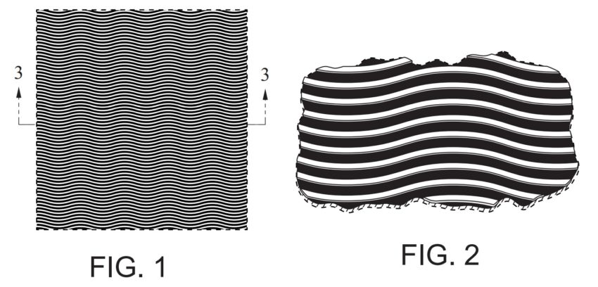 I would argue that even Columbia’s broader alternative approach is too narrow. In Columbia’s asserted patent, the images (below) show the use of the material as an inner liner for various articles of clothing as well as an outer liner for a sleeping bag. It would make sense to me that an ordinary observer might be deceived by other apparel liners using the same wave, even if not “heat reflective;” and thus that a jury should be permitted to consider those products as comparison prior art in the Egyptian Goddess infringement analysis. Unfortunately for Columbia, my broader notion of comparison prior art makes their case difficult since at least one of the comparison references shown to the jury was the wave pattern used as the outer liner of a rain jacket, US5626949, and all of the references are some form of fabric. Further, in some ways Columbia opened the door to a very broad scope of comparison prior art by including Figure 1 (shown above) claiming the material as a pattern apart from any particular application (such as those shown in other figures).